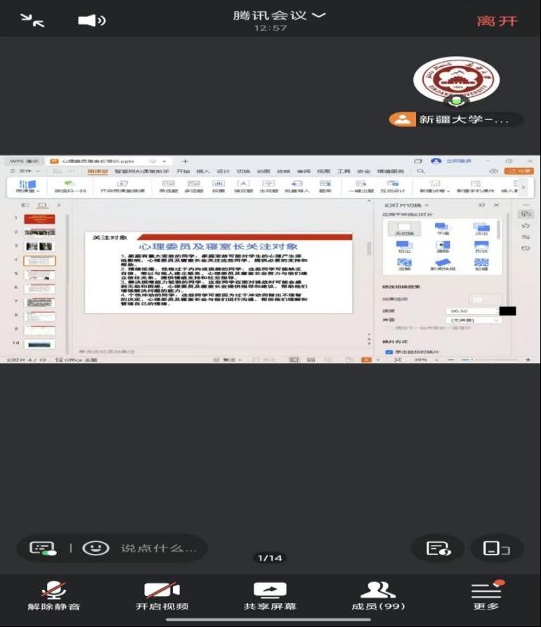 为进一步健全校园心理健康服务体系,充分发挥学生骨干在心理健康工作中的前沿排查与疏导作用,切实提升心理委员、宿舍长的沟通技巧、危机识别及应急应对能力,筑牢校园心理健康基层防护网。4月9日机械工程学院顺利开展2026年春季学期心理委员及宿舍长心理健康专题培训。本次培训由辅导员王惟民主讲,学院两校区全体心理委员、宿舍长线上线下同步进行学习。
