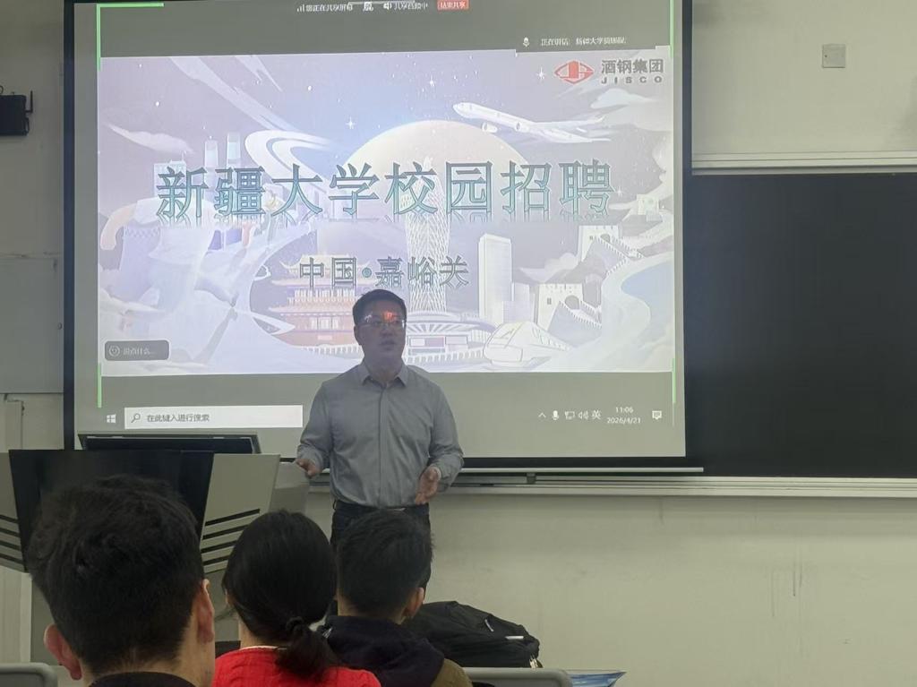 4月21日上午11:00,酒泉钢铁(集团)有限责任公司专场宣讲招聘会在机械楼A401顺利举行。为切实拓宽就业渠道、兼顾不同校区毕业生求职需求,本次宣讲会采用线上、线下同步开展的方式,精准对接专业需求,吸引了电气工程学院、机械工程学院、智能科学与技术学院、化工学院、法学院、外国语学院、计算机学院等多学院2026届相关专业毕业生40余名。