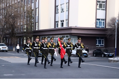 晨曦微露,国旗护卫队迈着铿锵有力的步伐,护送五星红旗入场。伴随着激昂雄壮的《义勇军进行曲》,五星红旗冉冉升起,全体师生肃立注目,高唱国歌,眼中满含对祖国的崇敬与热爱,现场氛围庄严肃穆。